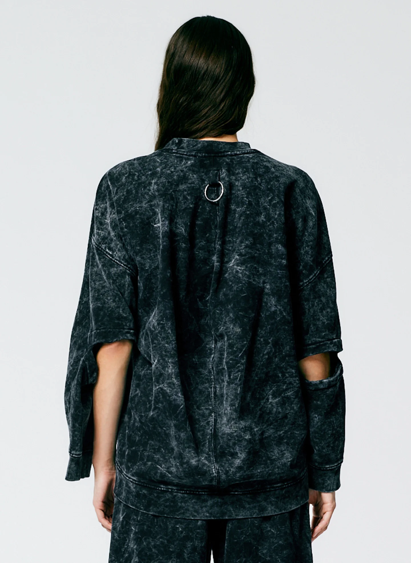 Derived from a familiar silhouette and produced in our signature acid wash, the Cocoon Crewneck Sweatshirt is the ideal foundation for smart, seasonless layers year-round. A detailed slit at the elbow creates for a small, but impactful statement, while also allowing for extra styling hacks as well as breathing room. Pair yours back to it’s matching Acid Wash Calders or a pleated skirt for laidback vibes or a bold colored Heel for an unexpected take on evening dressing.
