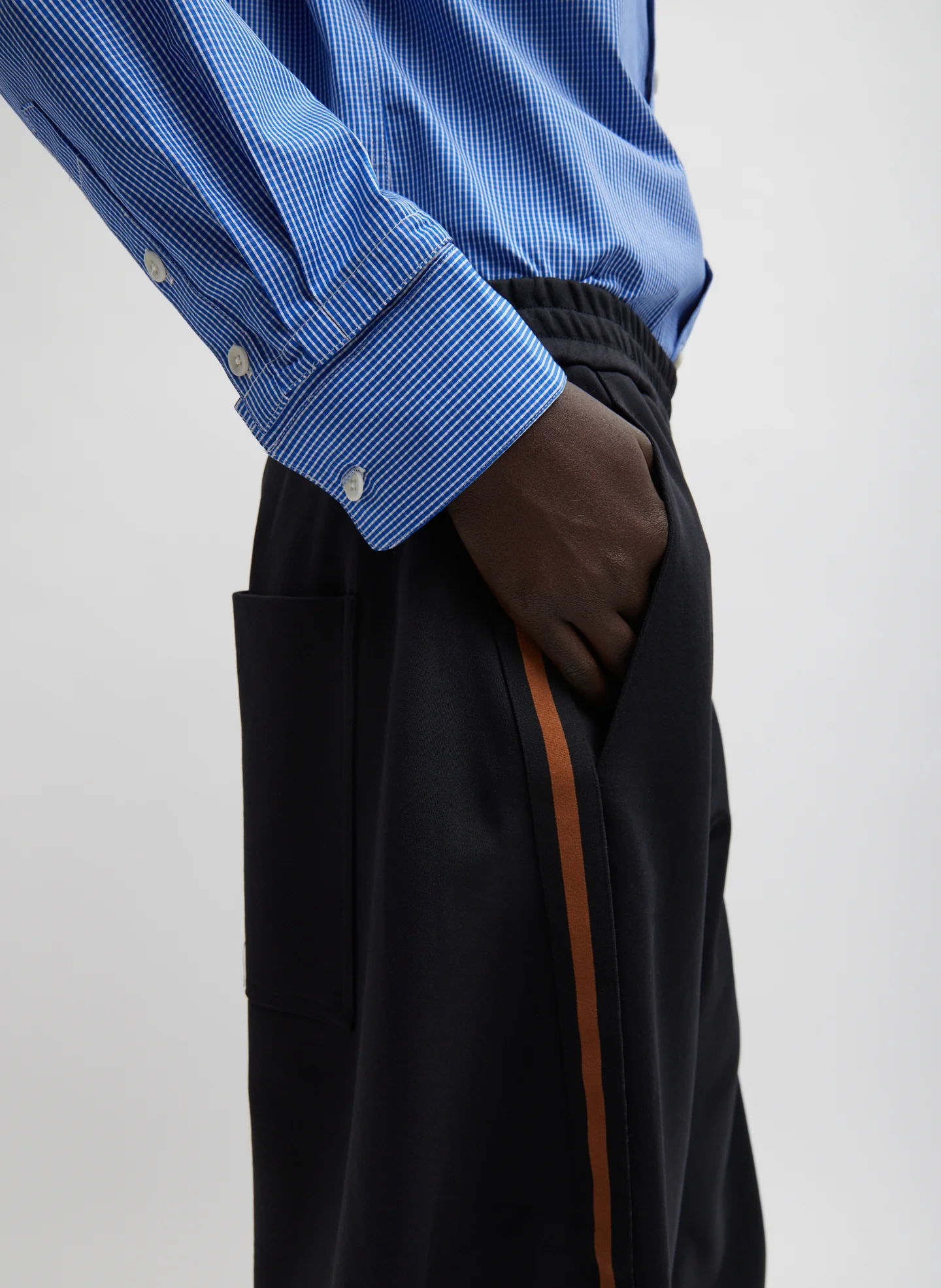 With its laid-back appeal and luxe fabrication, the Active Knit Winslow Pant returns for Fall 2024 with a minimal design update—a contrasting brown stripes that cascades down the leg—to finesse your style further. Chill, yet classic, the wide leg silhouette, snap hem details for temporary and customizable alterations to the wearer, and an adjustable high waistband to modernize this relaxed-yet-polished pant, solidifying its CMC status. Lean into your antonyms pairing back to the Mini Check Detached Shirt and white Larry Shoe for an unpredictable approach to fundamental fall outfitting.