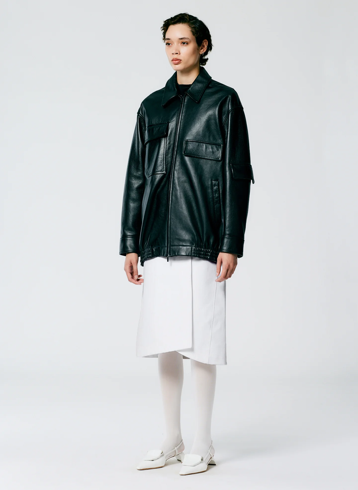 Our Aviator Leather Oversized Bomber is back and the kind of modern adaptation of a classic style that the Creative Pragmatist lives for. Bringing you the comfort and ease of a vintage leather jacket—sturdy, well worn and supple to the touch—with updated hardware and design details—like dual zipper capabilities for optimal styling—that set it apart from those you may have—collecting dust or in your current rotation. The unsung hero of your wardrobe now…and forever, this jacket will never spend much time on the hanger. Pair back to a Sculpted Cotton Pitched Skirt or Sculpted Cotton Sculpted Skirt and a slim top tucked in for a balanced look.