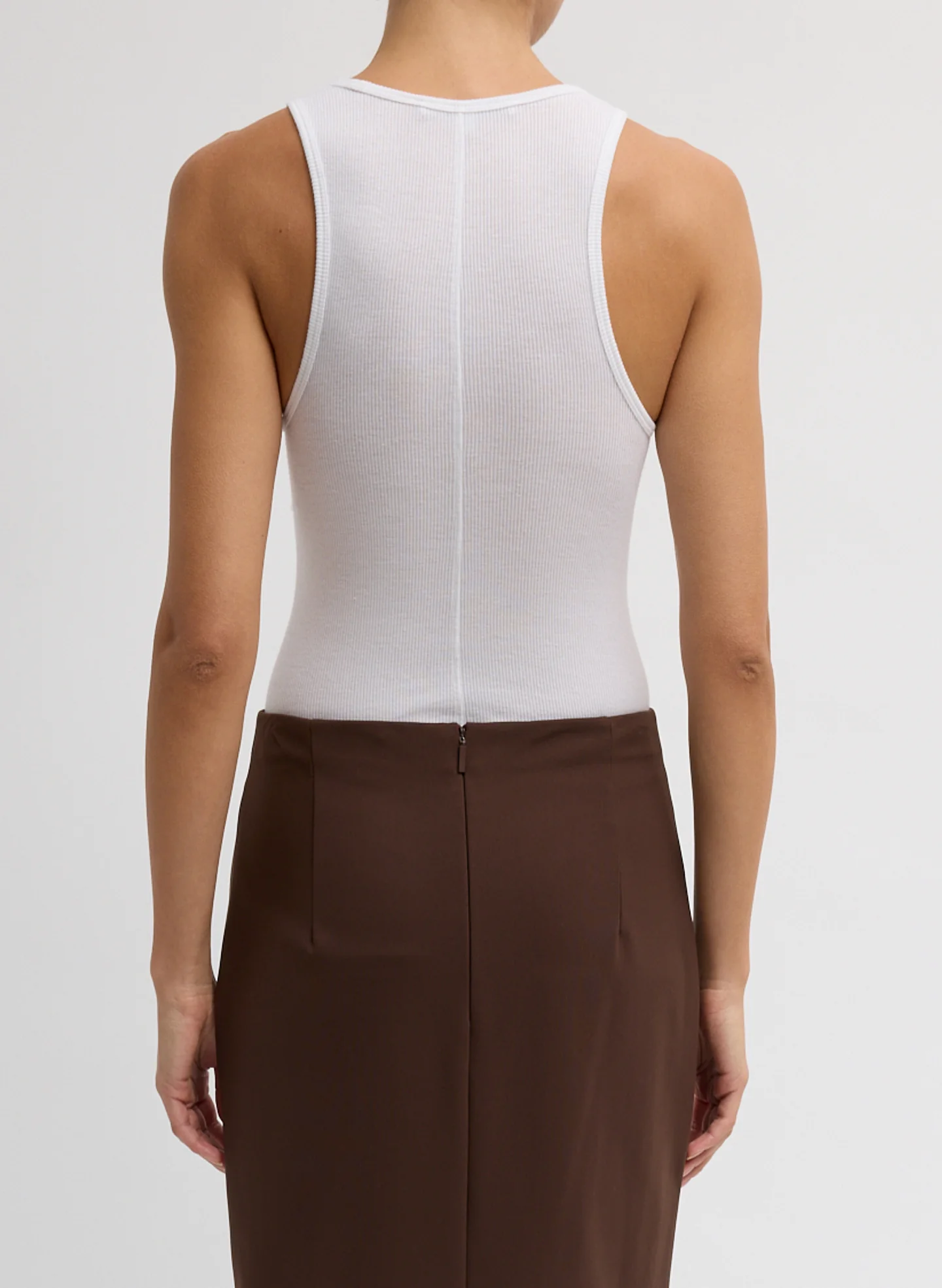 This assortment serves as your WOFs (Without Fails) and are designed to create space in your wardrobe for creativity and experimentation. No matter how extreme your closet may become, these pieces serve as the grounding element that ties everything together. Crafted from Peruvian 2x1 cotton, the Circular Fine Rib T-Shirt Tank is a cornerstone of any wardrobe. Designed for seamless layering or standalone styling, it offers a balance of modern design and pragmatic functionality. Available in Ring 1, 2, and 3 colorways of The Tibi Color Wheel, this tank is the foundation for versatile, creative dressing.