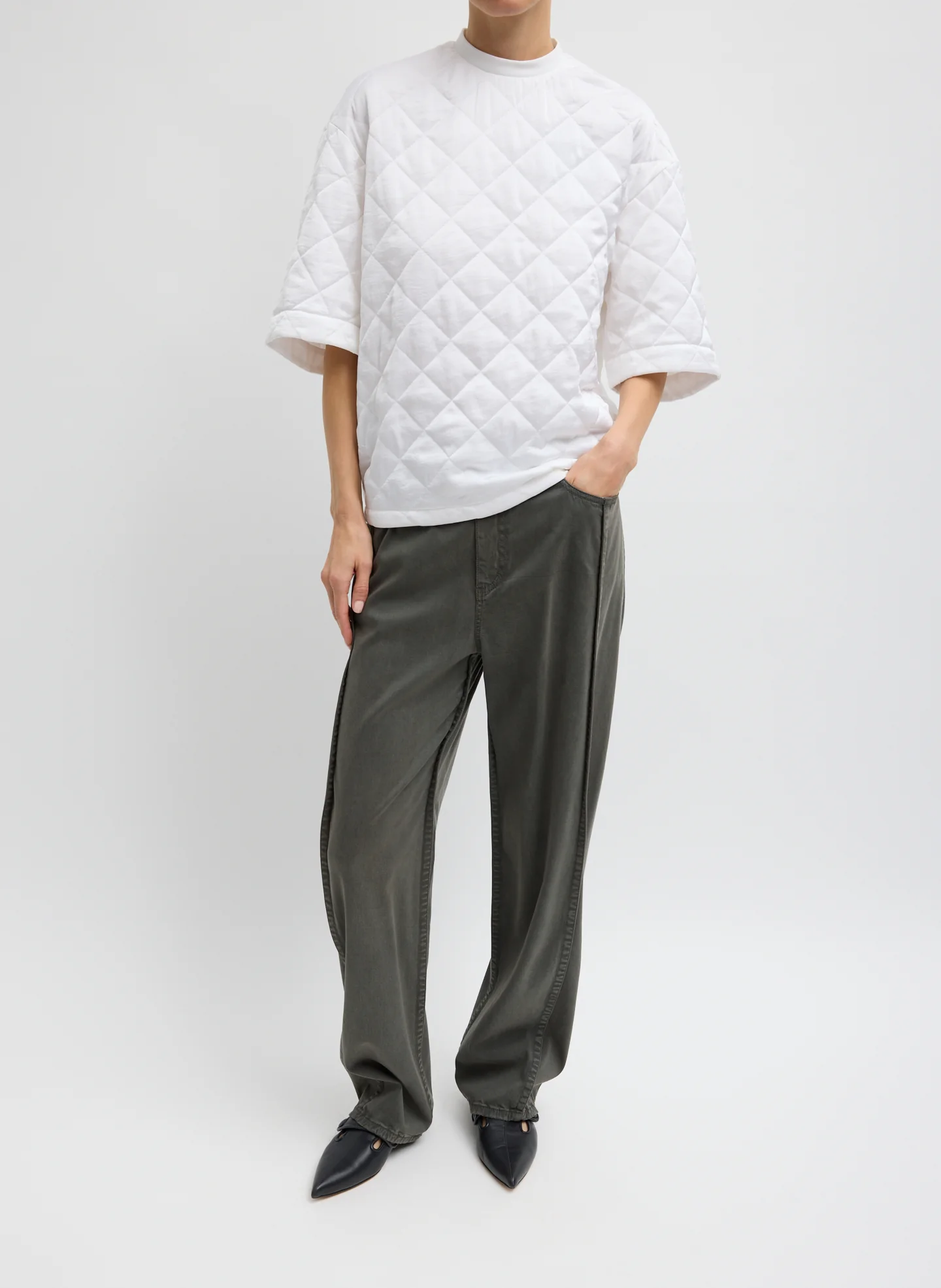 The Cozy Quilting Anorak T offers a new approach to structure and ease. Crafted from a lightweight Italian sateen with a silky, quilted hand, this piece features a drawstring cinch at the back waistband and a zip closure that allows you to adjust shape and proportion. Wear it loose for a relaxed, fluid silhouette or cinched for subtle definition. A polished take on utility, ideal for year-round layering. Pair back to the Nylon Snap Jogger for a fun play on texture and proportions or dress it up with a trouser or denim and a Milbourne Heel.