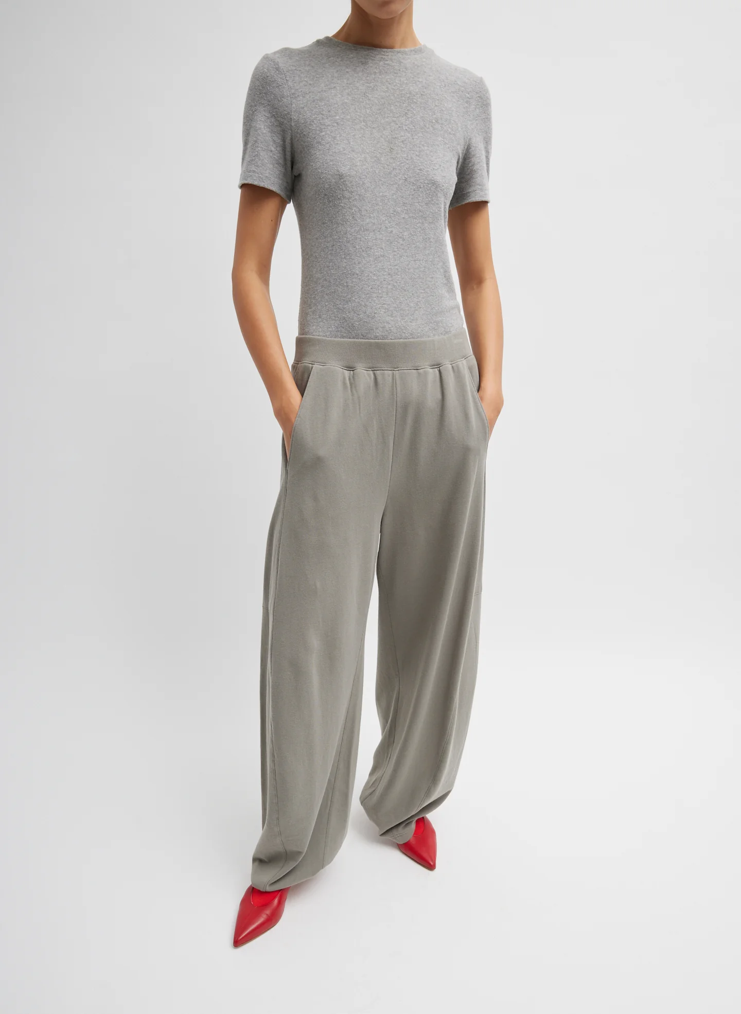 This assortment serves as your WOFs (Without Fails) and are designed to create space in your wardrobe for creativity and experimentation. No matter how extreme your closet may become, these pieces serve as the grounding element that ties everything together. Crafted in a soft and super light weight Peruvian terry, the Light Weight Sweatshirting Winslow Pants are refined enough to be worn with elevated separates and footwear as an alternate option to your trousers or as a cover up on your way to the beach. For those indecisive about tailoring, we heard your pleas and devised the ultimate style hack: a snap detail at the hem that allows you to adjust pant length on the fly without the commitment of permanent alterations. Now offered in White, Black, and our favorite Spring Ring 3 hue, Dark Stone. It's also worth mentioning that the waistband is elastic because we would never sacrifice style for the sake of comfort. Look no further for the ultimate CP sweatpant–creative on the surface, pragmatic in the fit.