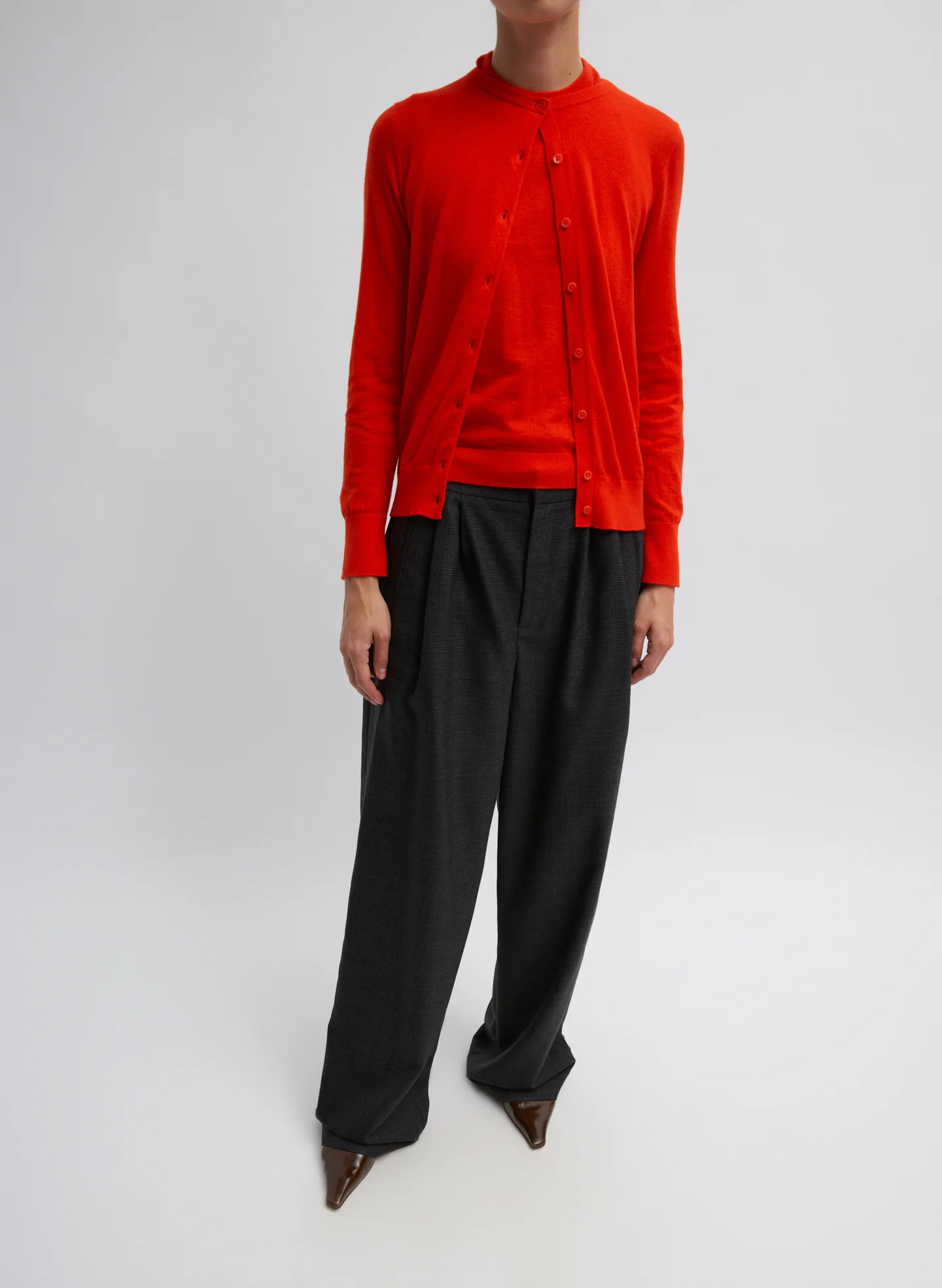 This assortment serves as your WOFs (Without Fails) and are designed to create space in your wardrobe for creativity and experimentation. No matter how extreme your closet may become, these pieces serve as the grounding element that ties everything together. The Skinlike Mercerized Wool Shrunken Cardigan is crafted from Australian wool fiber and then mercerized to produce a smooth surface with increased sheen. Multi-hyphenate by design and now available in three bold Ring 4 colors, Red, Melon Orange, and Green, this shrunken, long sleeve style is a true WOF that can be paired with the matching Shrunken Vest for an easy PDW look.