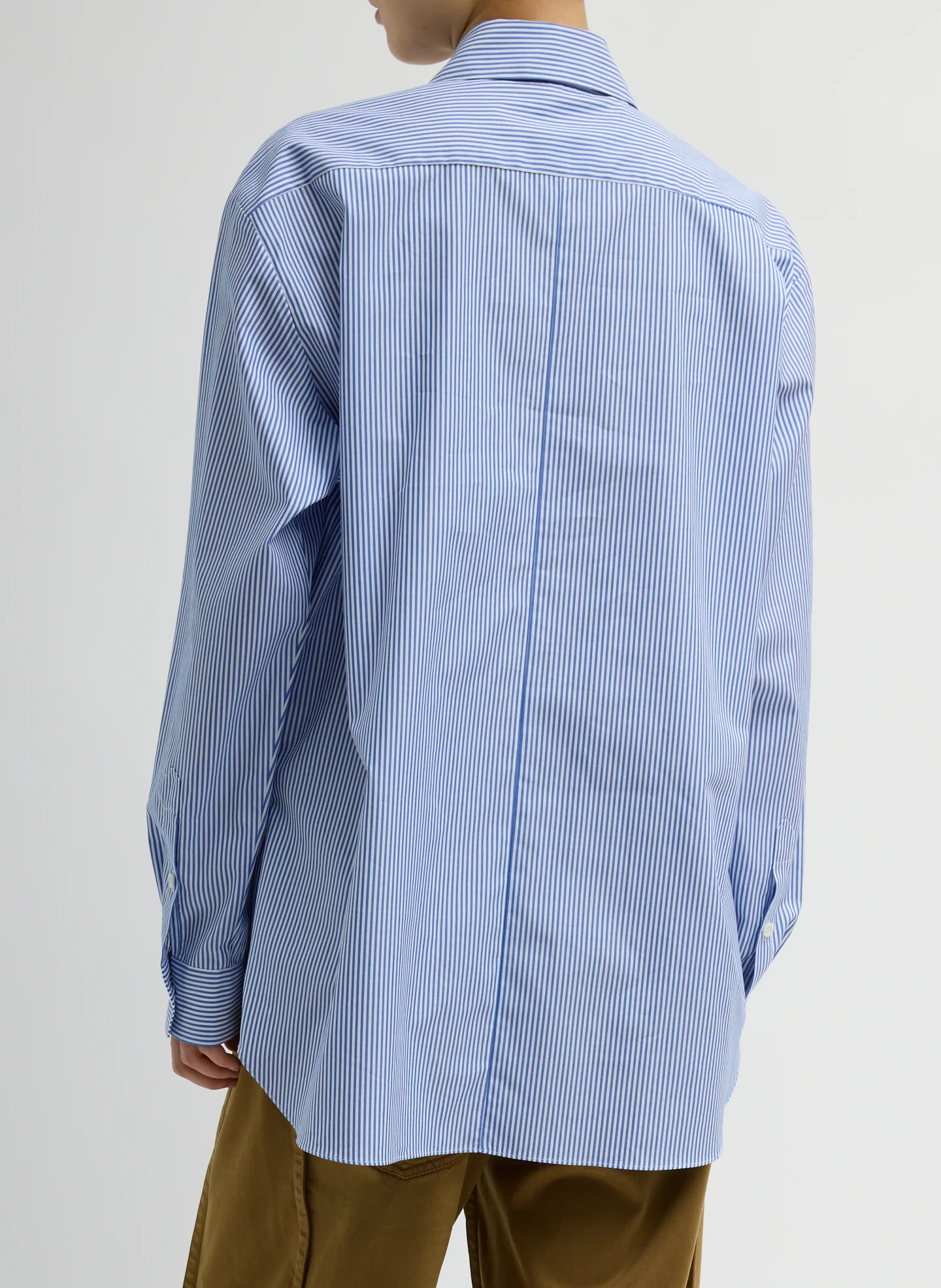A fresh take on a classic, designed for ease. Crafted from 100% cotton with a silky-smooth finish, the Striped Shirting Easy Tuxedo Shirt reimagines the refinement of a tuxedo silhouette with effortless wearability. Cut with a relaxed shape that can be worn loose for a laid-back attitude, tucked for polish, or layered for a high-low contrast. For an easy PDW approach, style it with the Garment Dyed Stretch Tuck Pant and a Christopher Heel for the perfect balance of Chill, Modern, and Classic.
