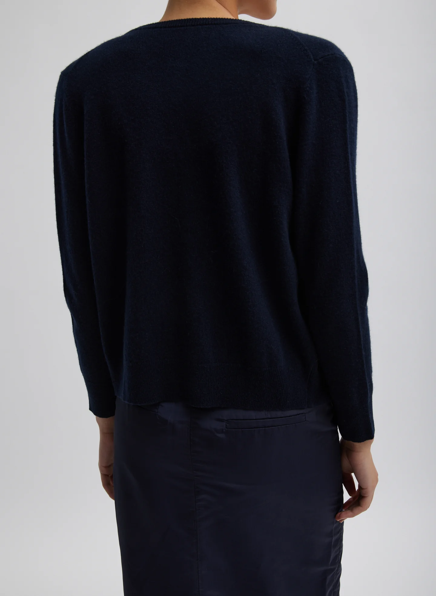 This assortment serves as your WOFs (Without Fails) and are designed to create space in your wardrobe for creativity and experimentation. No matter how extreme your closet may become, these pieces serve as the grounding element that ties everything together. The Washable Cashmere Shrunken Cardigan is created in a wool and cashmere blend, that is in fact washable. Multi-hyphenate by design and newly available in two fundamental colors for our WOF selections, Light Heather Gray and Navy, this shrunken, long sleeve style is a true WOF that can be paired with the classic wash denim Sid Jean and Washable Cashmere Cami for an easy PDW look.