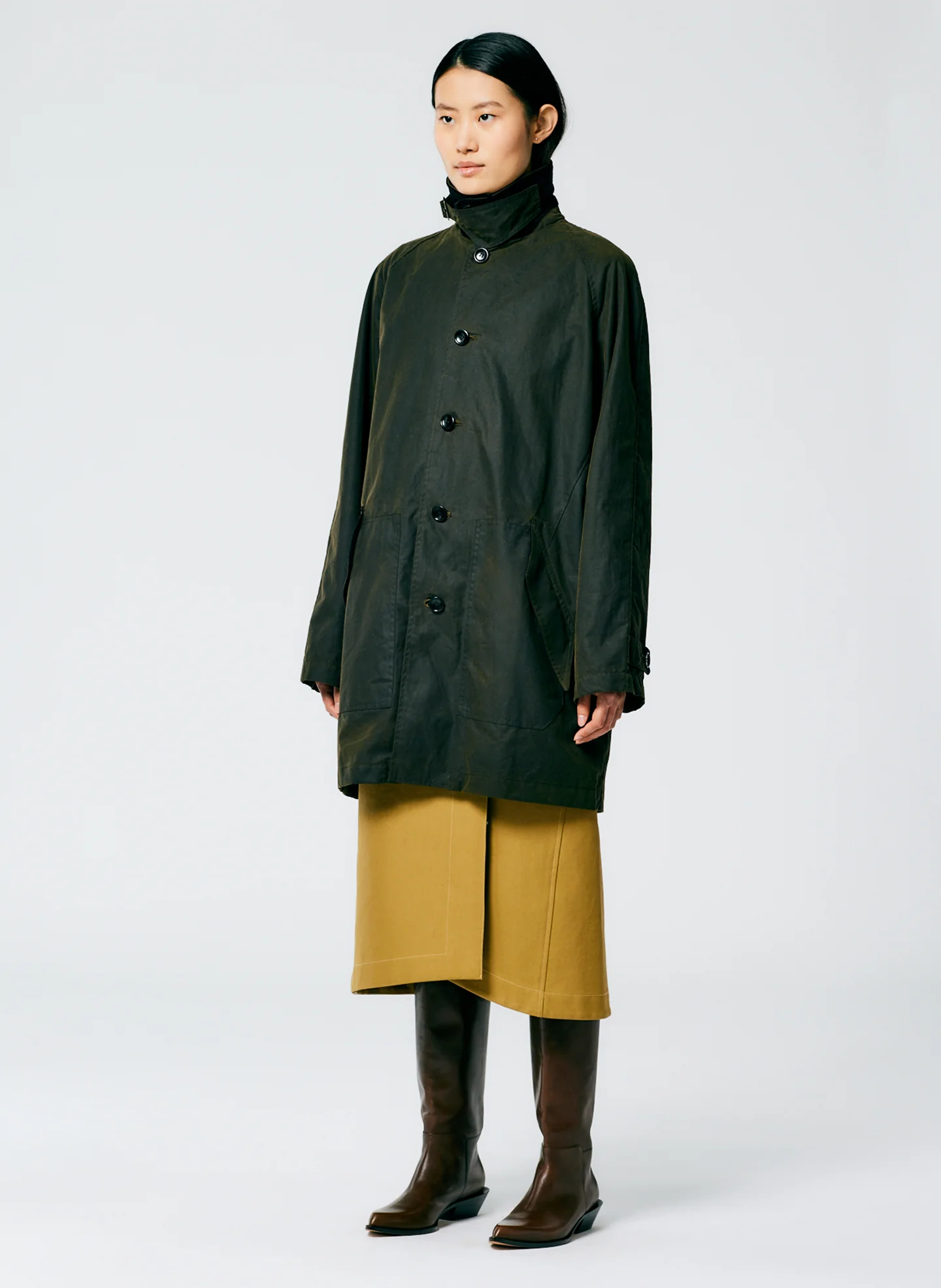 The Waxed Cotton Car Coat is the perfect coat for everyday wear. Designed with style and practicality in mind this jacket features multiple pockets to store anything you wish. Meticulously crafted from a durable organic waxed cotton that is meant to last years, this jacket will become your favorite fall Without Fail. Style this coat layered over the Sculpted Cotton Pitched Skirt and a tall boot for the perfect elevated cool-weather ensemble.